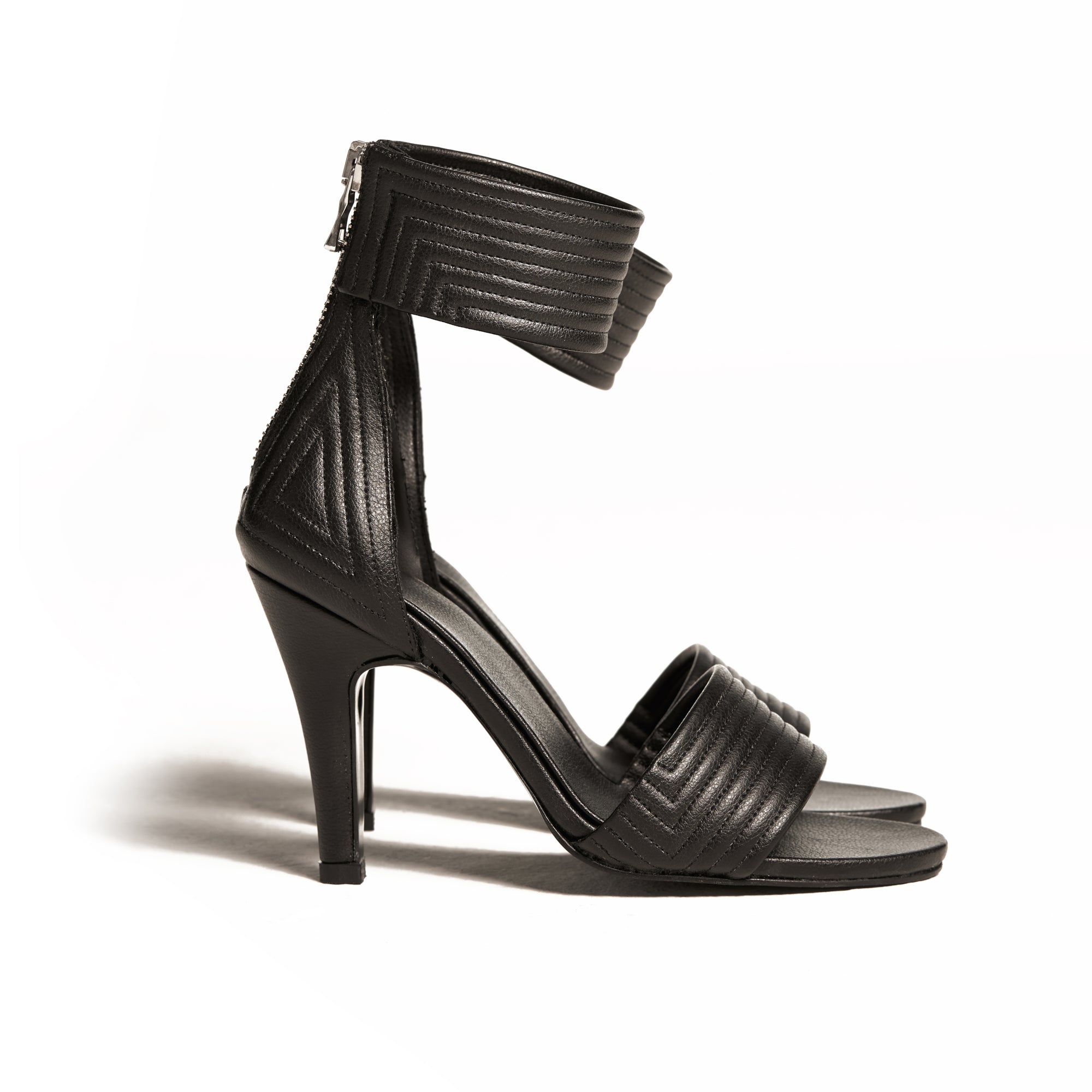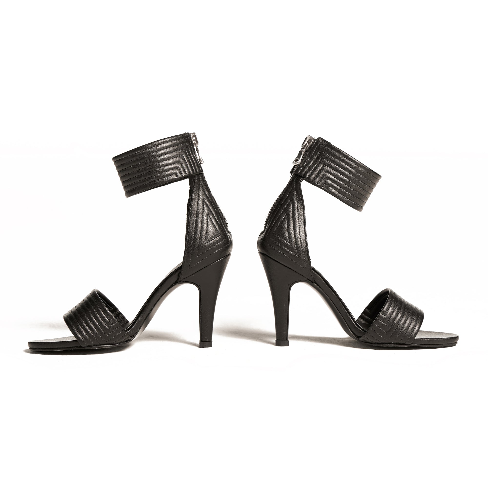 Handmade in new york. Hand lasted. Quilted ankle details, quilted forefoot strap details, quilted heel counters, 4 inch (10cm) cactus heel, zipper down the back of the heel.